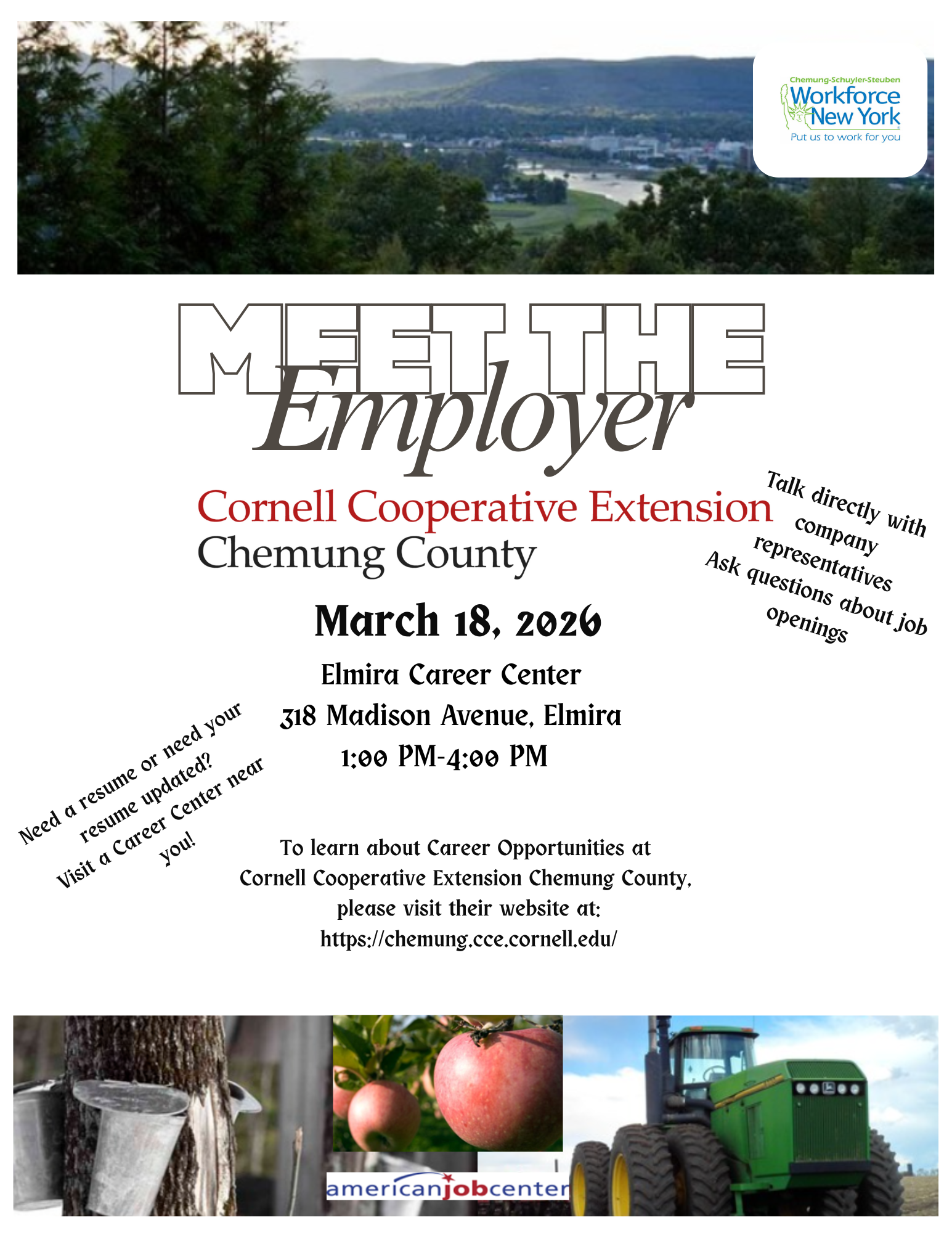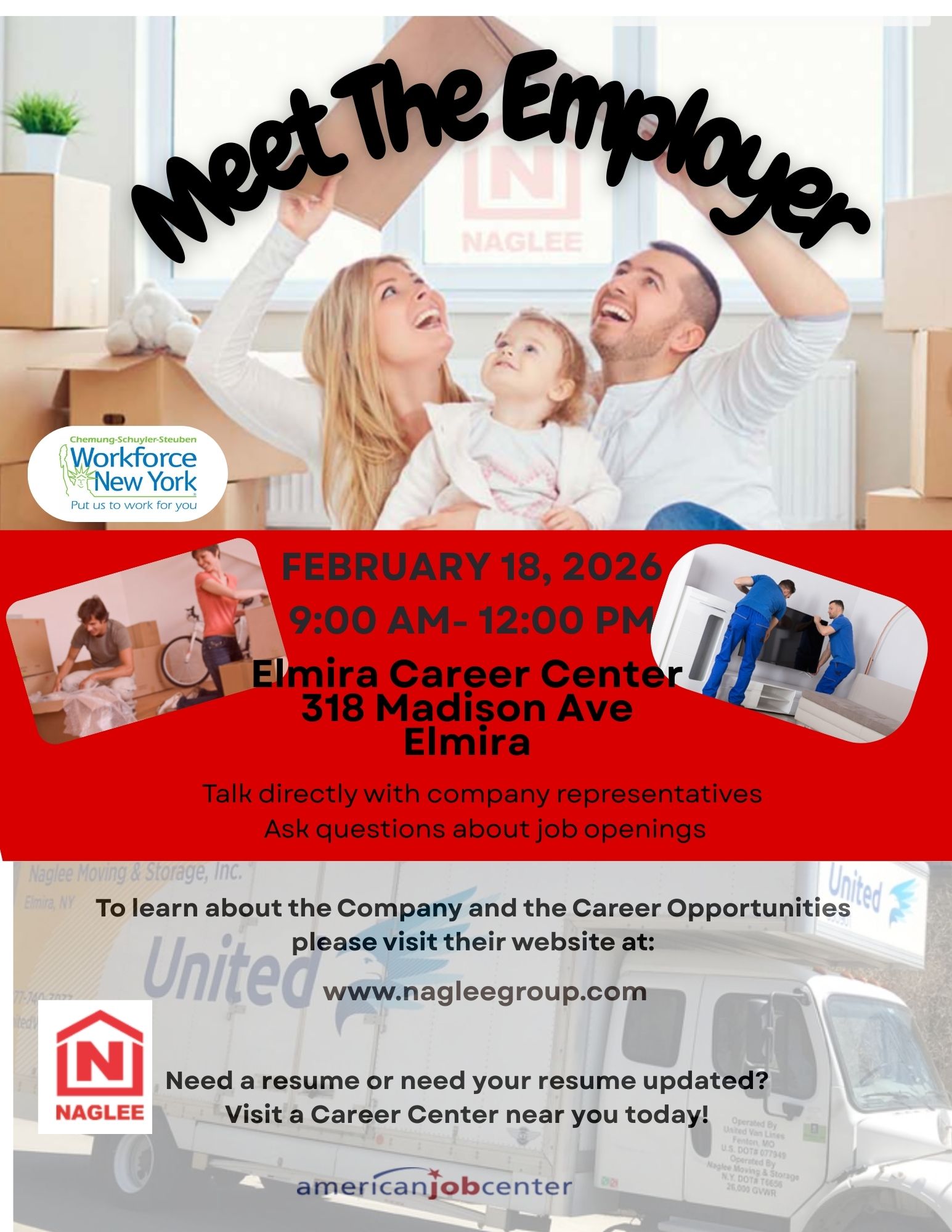 Upcoming Meet the Employer Events: (check back regularly for the latest updates on Meet the Employer events) - February 18 - Naglee Moving at Elmira Career Center, 318 Madison Avenue, 9:00 AM – 12:00 PM
