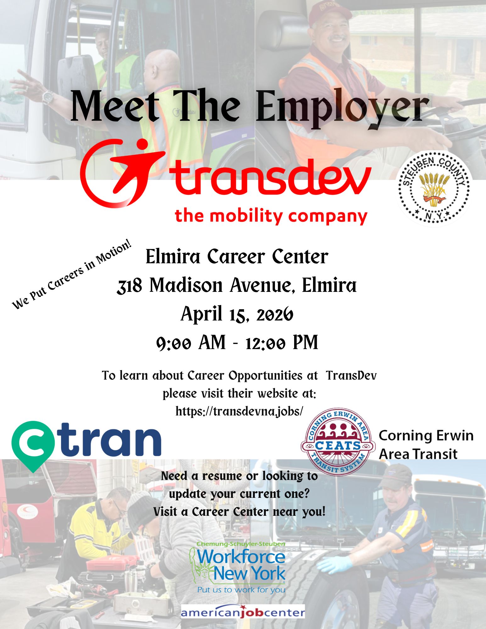 - April 15 - Transdev at Elmira Career Center, 318 Madison Avenue. 9:00 AM - 12:00 PM. Can't make it to the hiring event? Apply online at transdevna.jobs