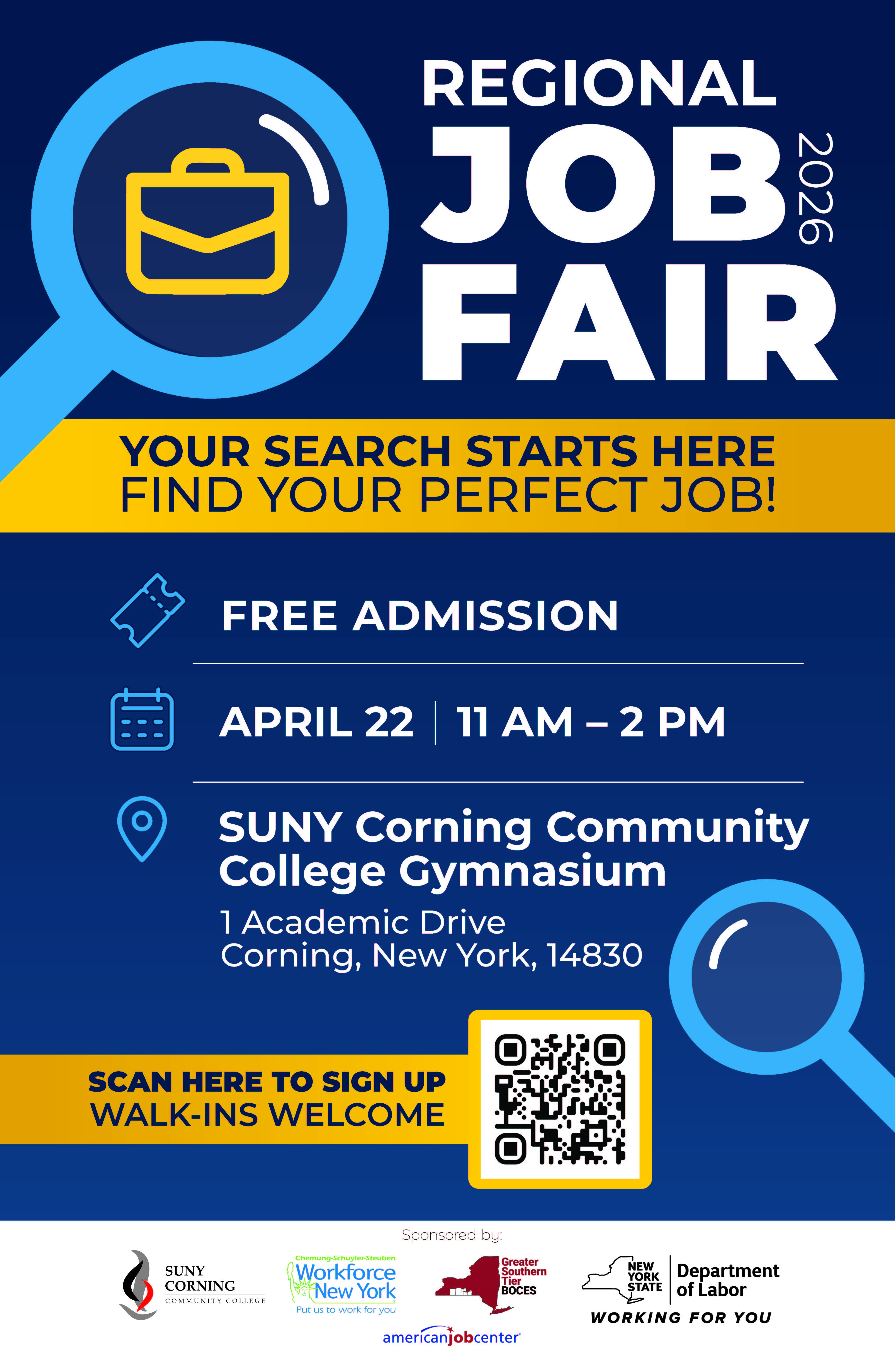 - Regional Job Fair April 22, 2026, 11:00 AM - 2:00 PM at SUNY Corning Community College Gymnasium 1 Academic Drive, Corning