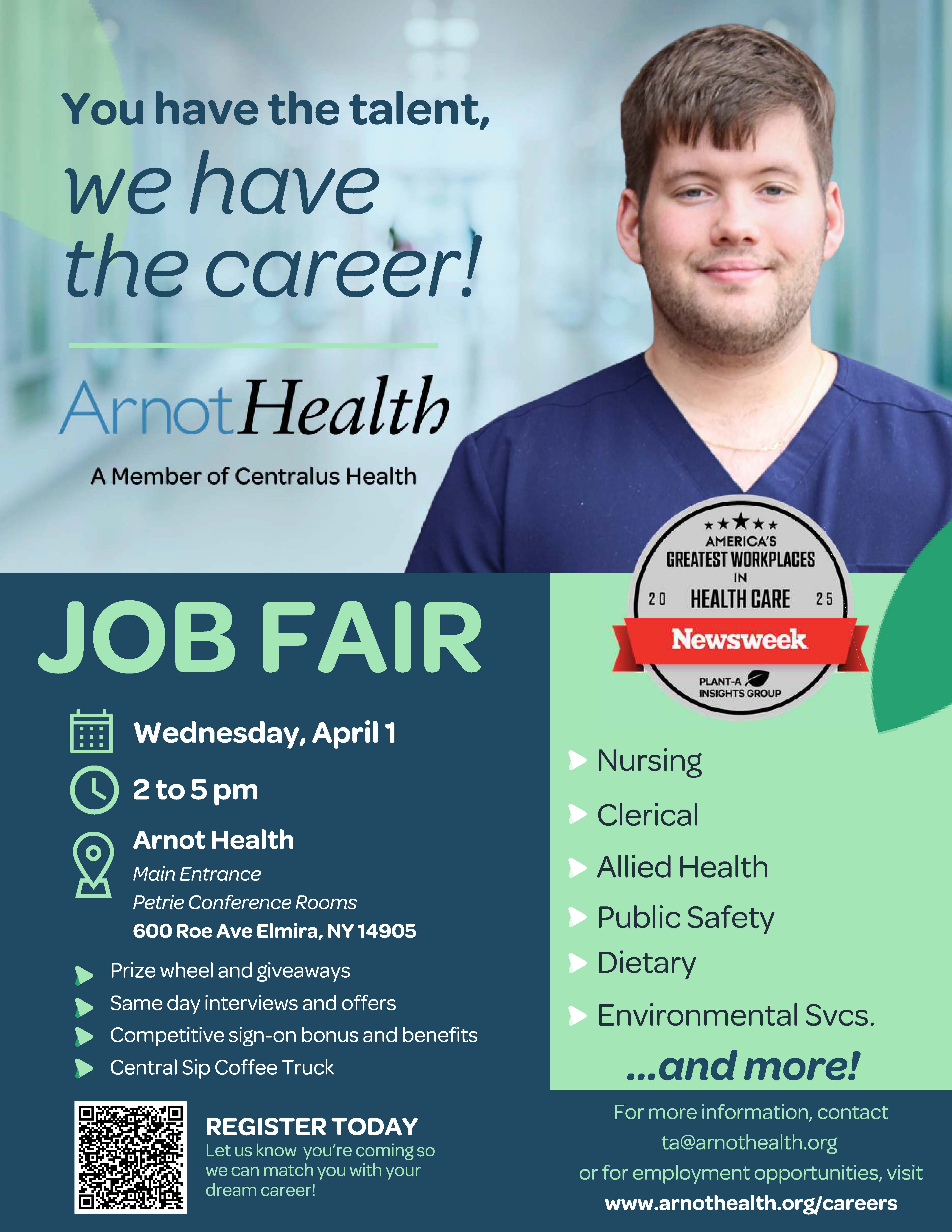 Job Fairs/Recruitments: - Arnot Health Job Fair - Wednesday, April 1, 2026, 2:00 PM - 5:00 PM. Held at the Petrie Conference Rooms (main entrance) located at 600 Roe Avenue, Elmira