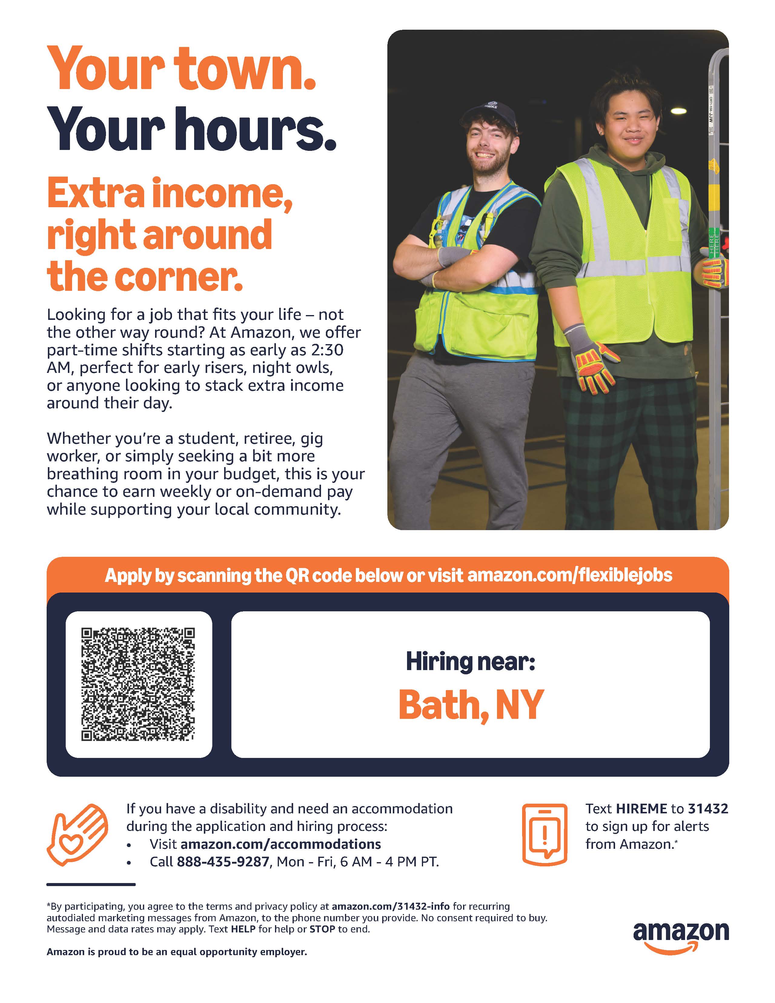 Amazon - Looking for a job that fits your life? The Amazon Warehouse in Bath is hiring! With a variety of opportunities, great perks, and easy application process, now is a great time to get started. Click here for to search current openings and view instructions on how to apply. Don't miss out on the chance to build your future with a company that values its team!
