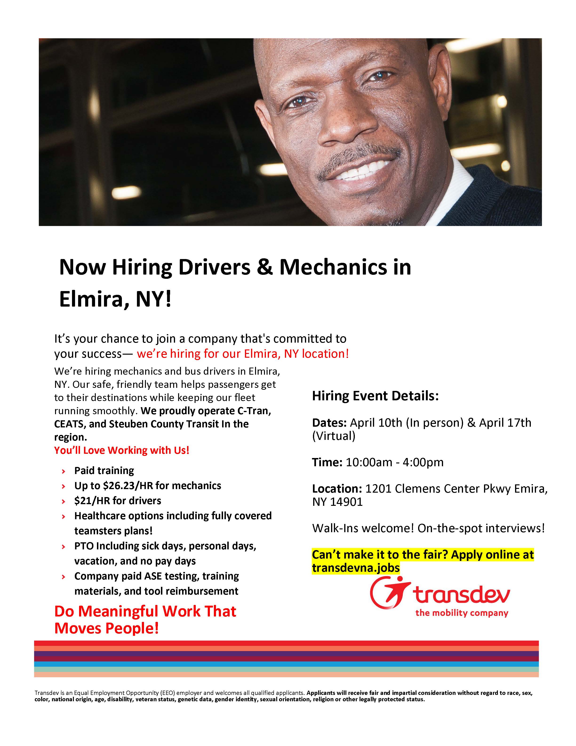 - Transdev Hiring Event - April 10, 2026, 10:00 AM - 4:00 PM (in person) at 1201 Clemens Center Parkway, Elmira & April 17, 2026, 10:00 AM - 4:00 PM (Virtual). Can't make it to the hiring event? Apply online at transdevna.jobs